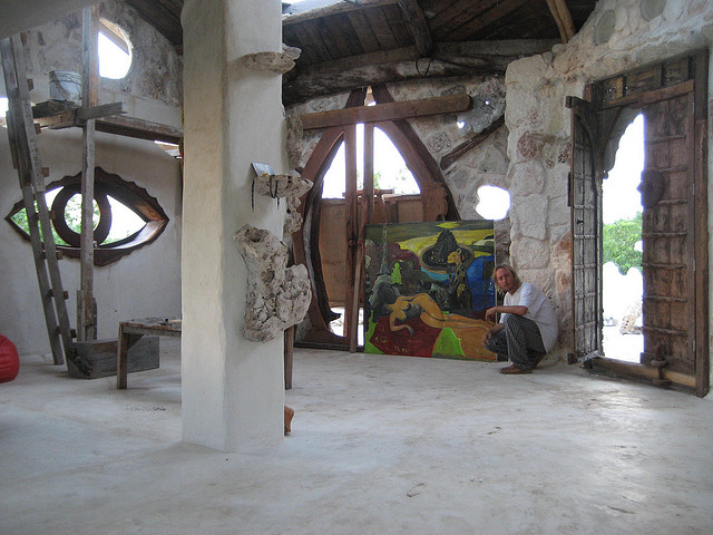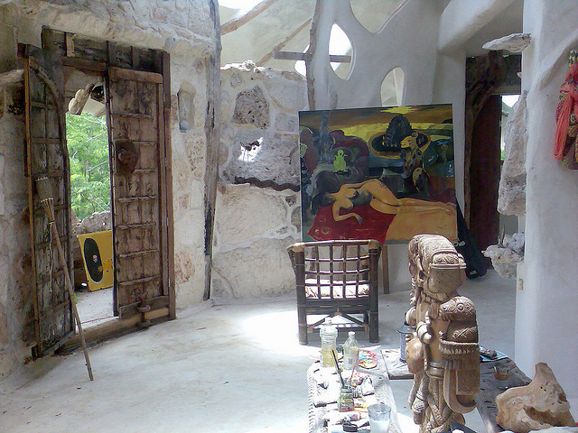 Sac-Be, camino blanco traducido en lengua maya, es el nombre que recibe el lugar donde se gestan la mayoría de sus obras producidas en México. Nos situamos en una torre, en donde se puede vislumbrar la selva de Yucatán como un tapete hecho de fibras naturales, el ocaso y la inmensa gama de tonalidades del cielo, por las paredes se enredan de forma natural algunas lianas de flores de la pasión, maracuyá, crecen papayas y platanares inmensos que rodean el taller, el sonido de la selva, el canto de las aves o el respirar de la tierra durante la noche silenciosa… Si sales encontraras el camino blanco de tierra caliza que de manera sutil te lleva a visitar inmensas cuevas subterráneas cubiertas de agua dulce y cristalina, bien conocidos por el nombre de cenotes a los que antiguamente los mayas decían era el vientre de la “Pacha Mama” o madre tierra en donde se gesta el principio de la vida sobre la tierra. Este es el panorama del taller al que él considera su gran escultura, su obra maestra. Obras como “Cactus head” (Cabeza de cactus) o “Mosquito”, son obras de su mas tardío periodo, donde vemos claramente la fuerte influencia del trópico.